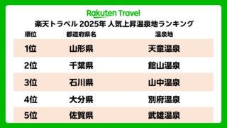 楽天グループが運営する旅行予約サービス「楽天トラベル」は、「2025年 人気上昇温泉地ランキング」を発表しました。このランキングは、2025年の延べ宿泊者数の前年比を基に集計されたものです。1位には山形県の「天童温泉」が輝き、前年同期比約1...