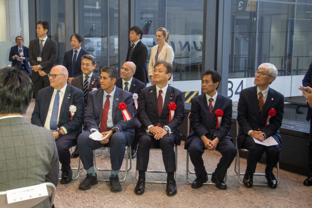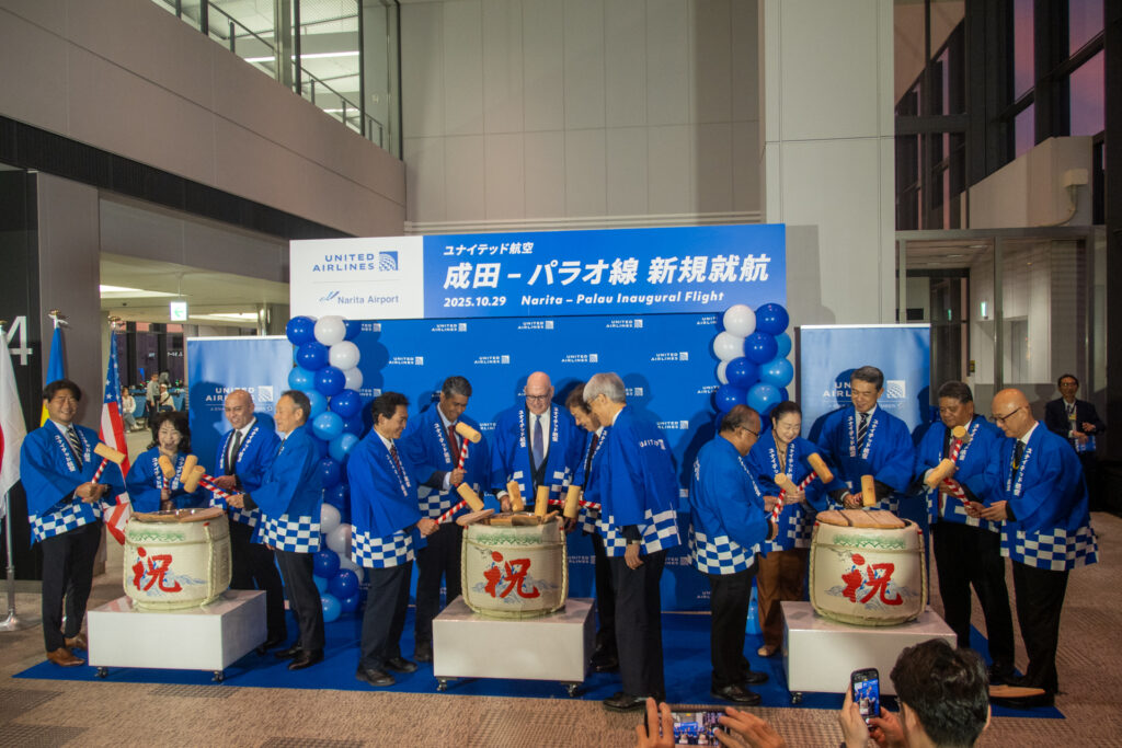 就航記念式典には、パラオ共和国のスランゲル・ウィップス・ジュニア大統領閣下、ユナイテッド航空のスティーブ・モリッシー国際規制・政策担当副社長をはじめ、外務省の堀井巌外務副大臣、国土交通省、成田国際空港の関係者など、多数の来賓が出席した。式典では、日本の伝統において福と新たな始まりを象徴する鏡開きが執り行われ、新路線の門出を祝った。