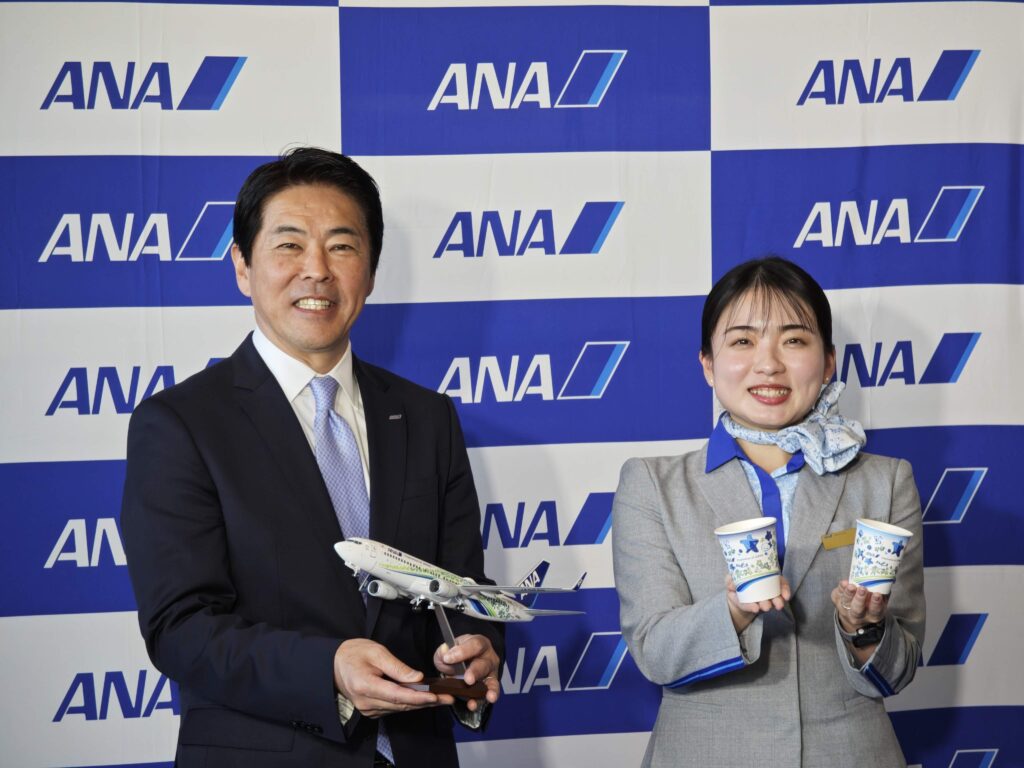 大阪・関西万博ジェット(JA58AN)の想いを継承し、B737-800型機がリニューアル。47都道府県の花が描かれたデザインで日本全国を飛び回ります。機内では特別支援学校の生徒がデザインしたエプロンや紙コップも順次導入予定です。