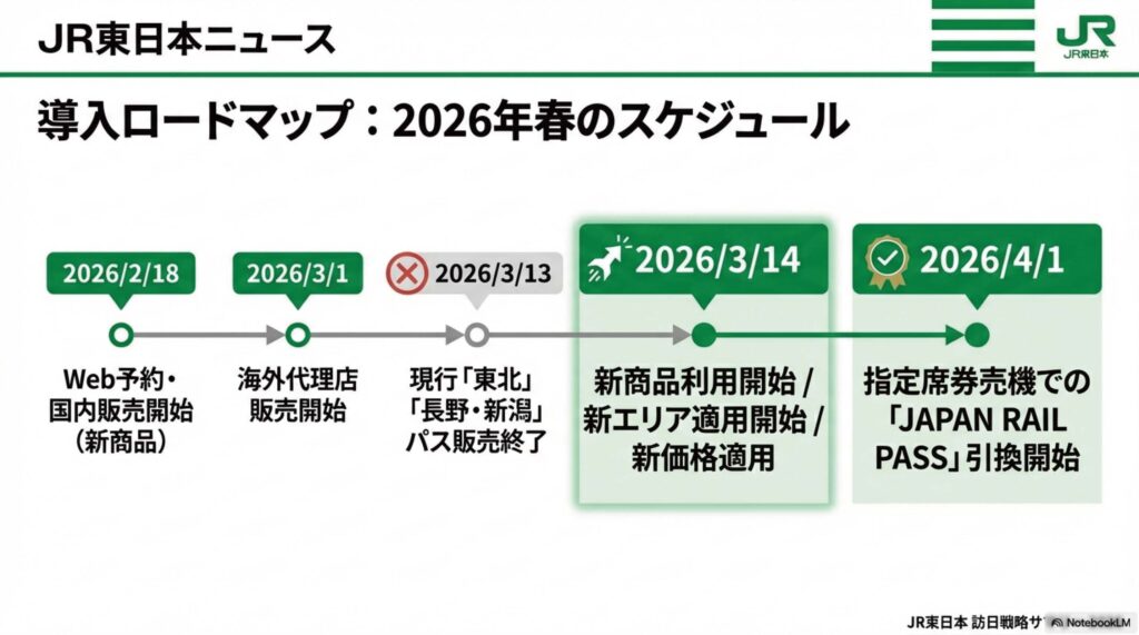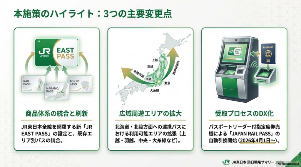 東日本旅客鉄道(JR東日本)は2026年1月28日、訪日外国人旅行者向けの鉄道パス(企画乗車券)の商品体系を大幅に見直すと発表しました。新たな主力商品として、JR東日本全線が利用可能な「JR EAST PASS」を新設するほか、他社との共同設定商品のエリア拡大および価格改定を行います。新商品の利用開始および改定は、2026年3月14日から適用されます。