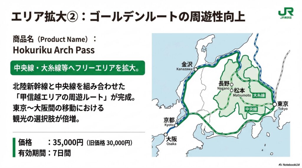 - Hokuriku Arch Pass JR西日本との共同商品です。首都圏および中央線、大糸線などがフリーエリアに追加され、甲信越エリアへの周遊性が向上します。 価格は現行の30,000円から35,000円(7日間有効)に改定されます。
