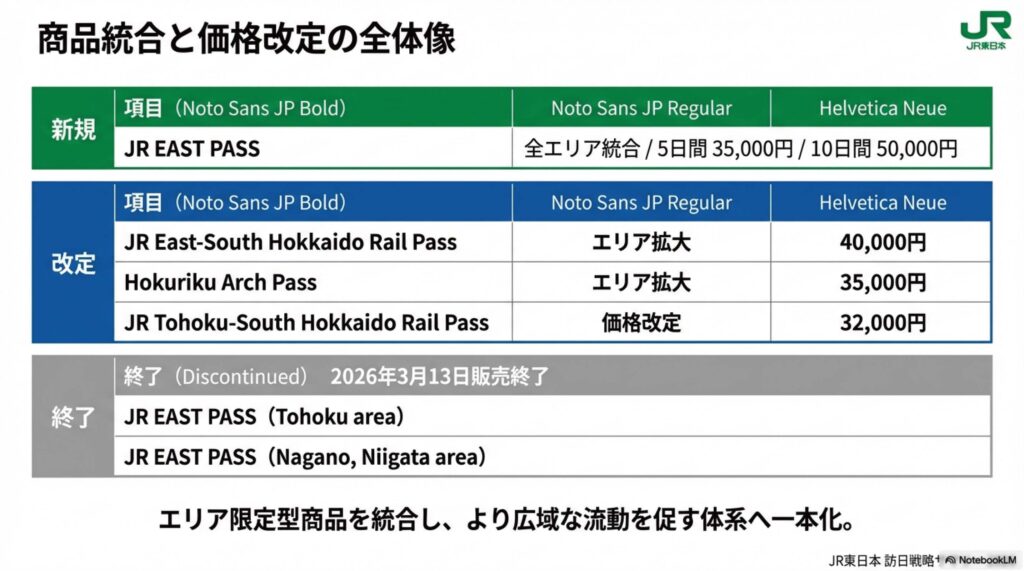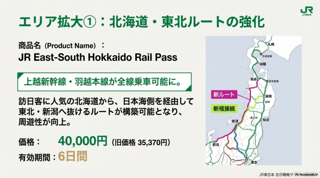 - JR East-South Hokkaido Rail Pass JR北海道との共同商品です。従来のエリアに加え、上越新幹線や羽越本線が全線乗車可能となり、新潟エリアへのアクセスが強化されます。これにより、北海道から東北、新潟への広域周遊を促進します。 価格は現行の35,370円から40,000円(6日間有効)に改定されます。