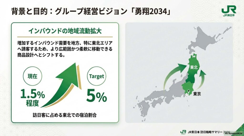 ■背景と目的 今回の見直しは、同社のグループ経営ビジョン「勇翔 2034」に基づくものです。増加するインバウンド需要に対し、首都圏や人気観光地だけでなく、東北や信越などの地方エリアへの流動を拡大させることが目的です。特に東北エリアにおける訪日客の宿泊割合を、現在の約1.5%から5%程度まで引き上げることを目標としています。
