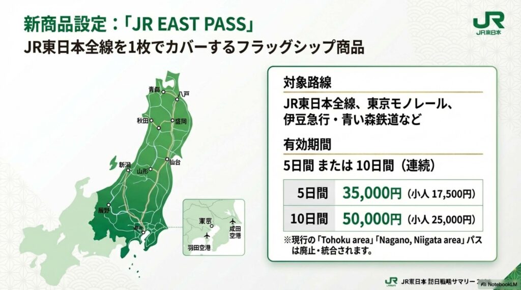 ■新設される「JR EAST PASS」 これまでエリア別に販売されていた「JR EAST PASS (Tohoku area)」および「JR EAST PASS (Nagano, Niigata area)」は、2026年3月13日をもって販売を終了します。これに代わり、JR東日本全線と一部の私鉄線が利用可能な新しい「JR EAST PASS」が設定されます。 新パスの価格は、有効期間5日間用が35,000円(小人17,500円)、10日間用が50,000円(小人25,000円)です。利用範囲にはJR東日本全線に加え、東京モノレール、青い森鉄道、いわて銀河鉄道、三陸鉄道、北越急行、伊豆急行などが含まれます。