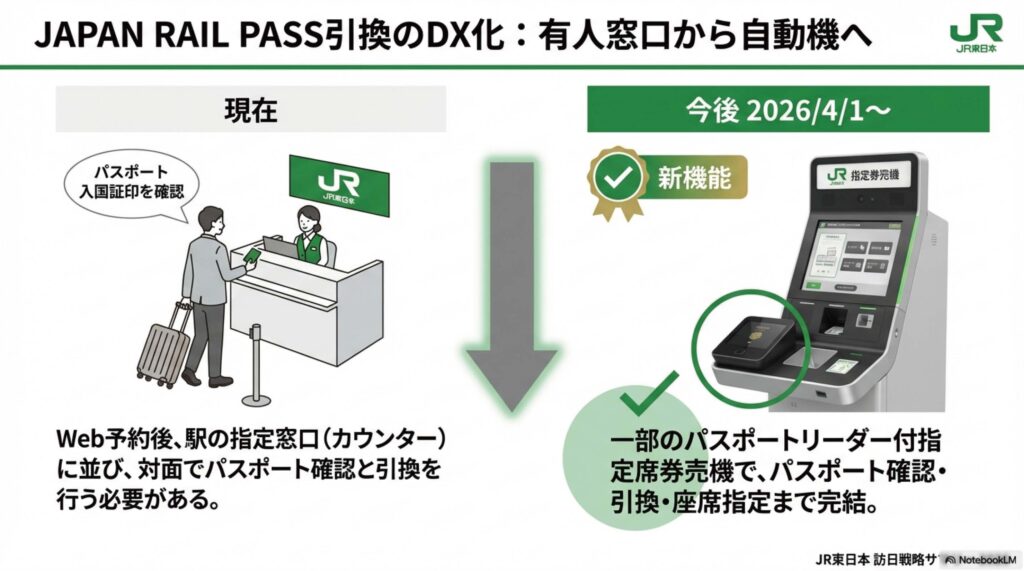■ジャパン・レール・パスの引換利便性向上 また、JRグループ全体で提供している「ジャパン・レール・パス(JAPAN RAIL PASS)」の受取方法についても変更が発表されました。2026年4月1日より、専用Webサイト(JAPAN RAIL PASS Reservation)で予約したパスについて、パスポートリーダー付きの指定席券売機での引換が可能になります。 これまでは窓口でパスポートと入国認証を確認する必要がありましたが、今後は対象の券売機にて、パスポートの写真ページと短期滞在シールを読み取ることで自動発券が可能となり、窓口の混雑緩和と利便性向上が期待されます。