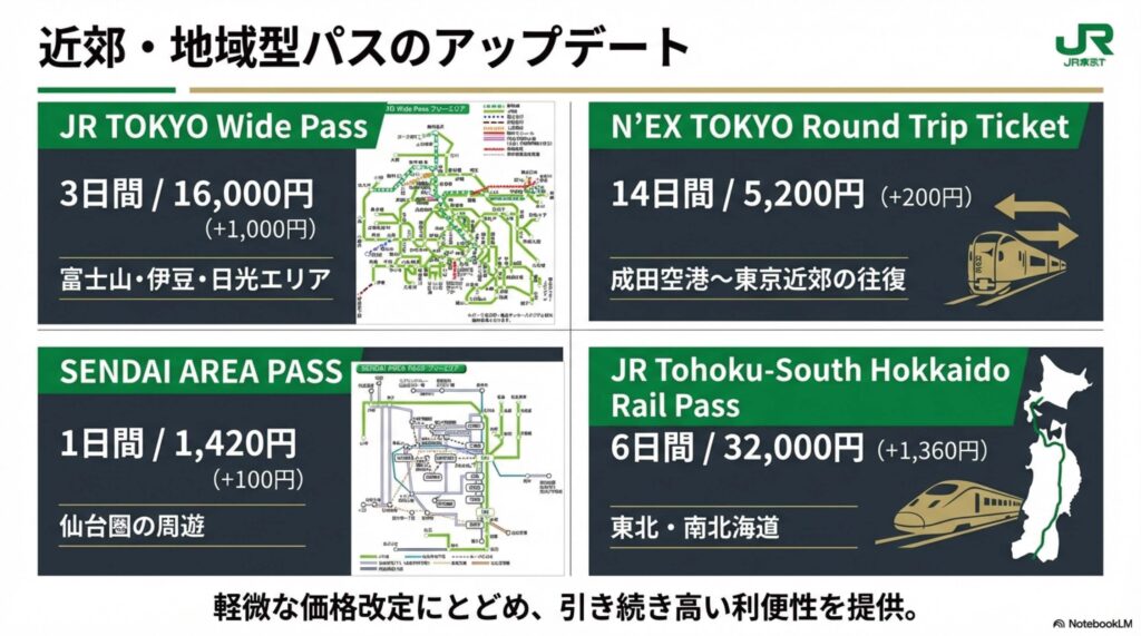- JR TOKYO Wide Pass(3日間): 15,000円から16,000円へ変更。