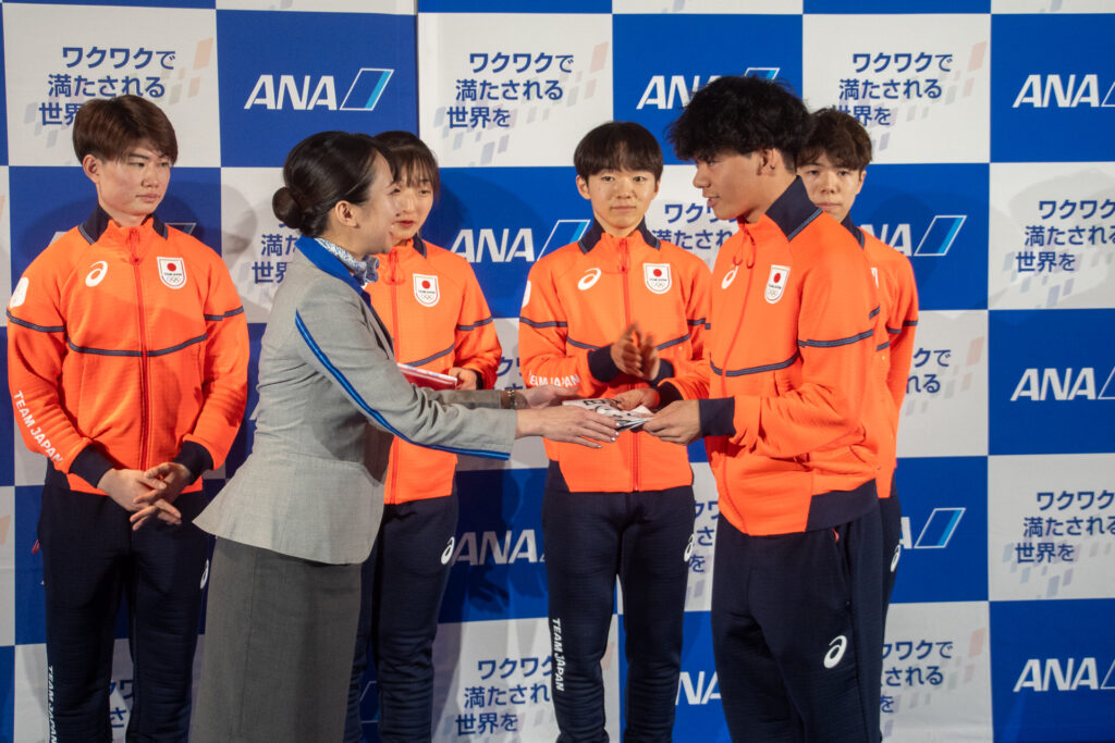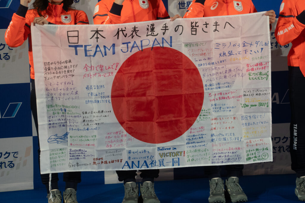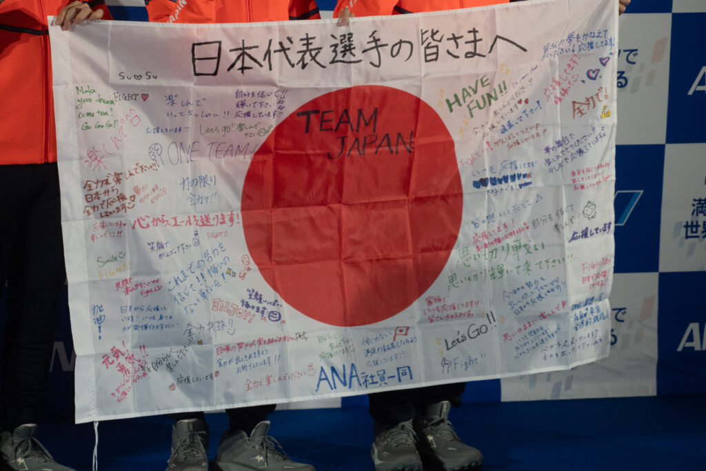 セレモニーは国際線出発ゲートエリアにて行われ、ANAスタッフより「4年間の努力が実を結ぶよう応援している」とのメッセージが送られ、選手代表へ寄せ書き入りの国旗が贈呈されました。