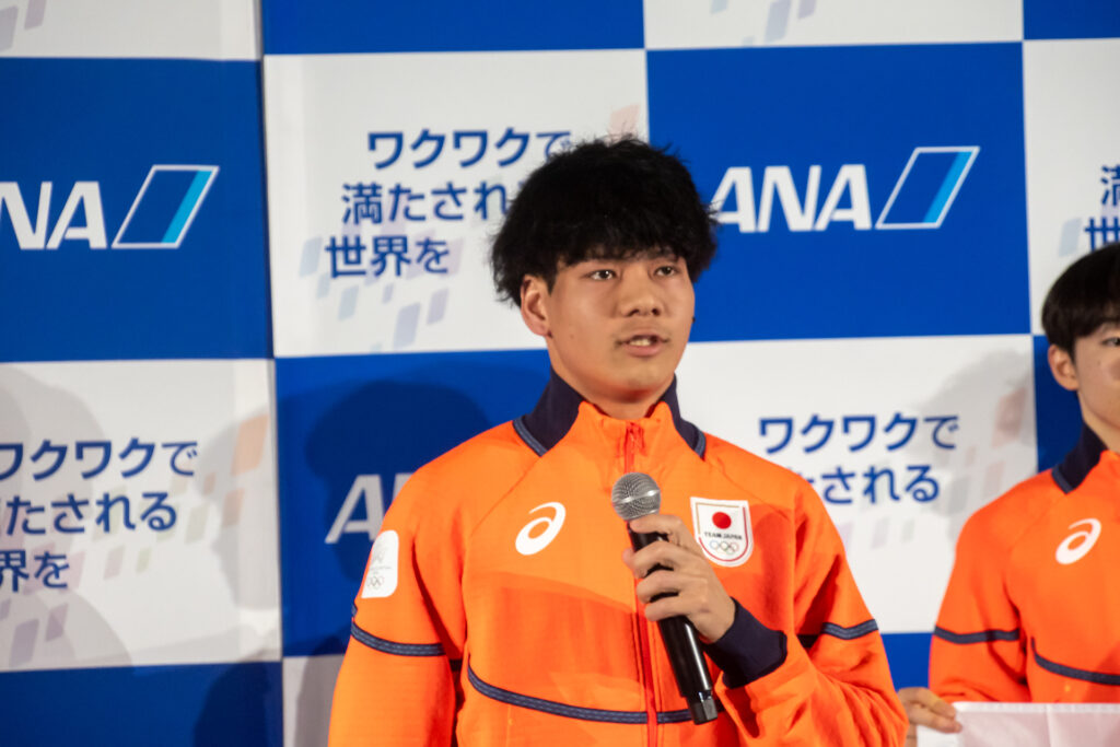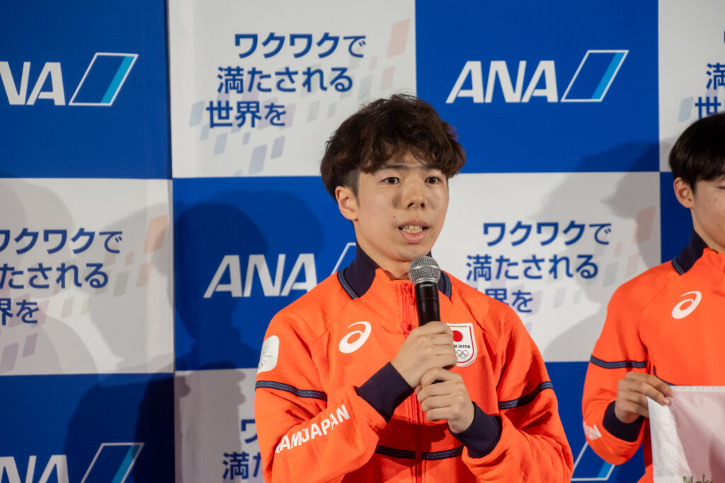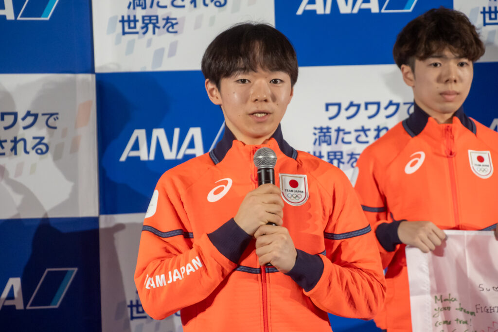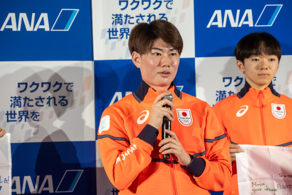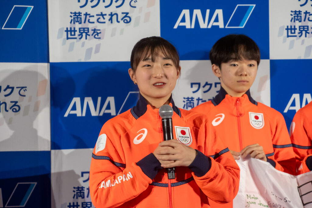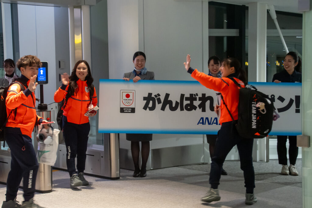 搭乗に先立ち、各選手がインタビューに応じました。自身3度目のオリンピックとなるフィギュアスケート女子の坂本花織選手は、「過去2大会の経験を生かし、今回も自分らしく思い切りのいい演技ができるよう精一杯頑張りたい」と抱負を述べました。男子シングルの鍵山優真選手は、2回目の出場であることに触れ、「目標とする点数や結果の達成に加え、フィギュアスケートの魅力や素晴らしさをパフォーマンスで伝えたい」と意欲を見せました。
