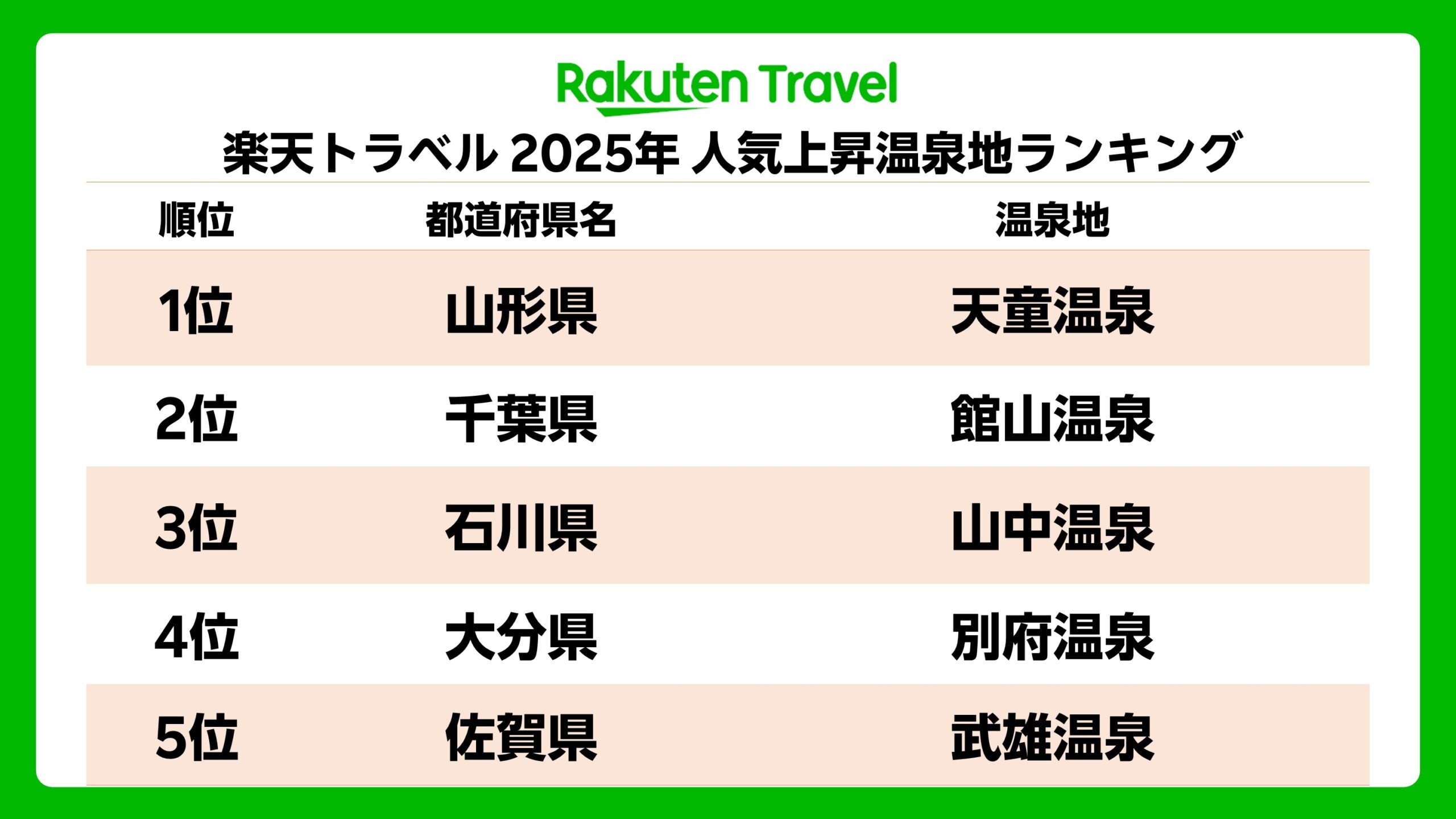 楽天グループが運営する旅行予約サービス「楽天トラベル」は、「2025年 人気上昇温泉地ランキング」を発表しました。このランキングは、2025年の延べ宿泊者数の前年比を基に集計されたものです。