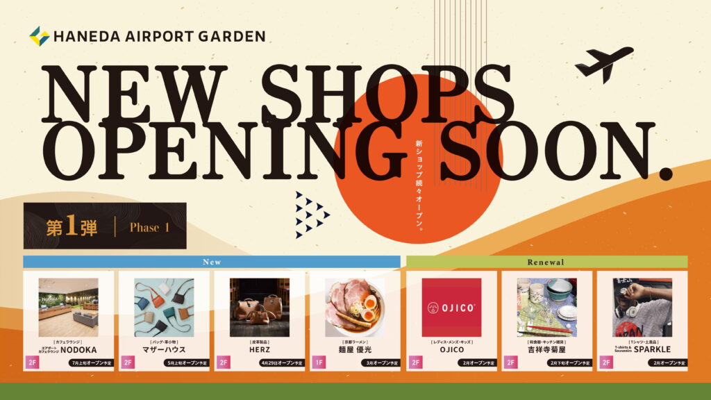 新規オープン店舗の第1弾として、以下の4店舗が発表されました。京都の人気ラーメン店「麺屋 優光」(2026年3月予定)、手作り鞄工房「HERZ」(2026年4月29日予定)、バッグ・革小物「MOTHERHOUSE」(2026年4月下旬予定)、そして24時間営業の「エアポートカフェラウンジNODOKA」(2026年7月上旬予定)です。また、既存の3店舗「OJICO」、「吉祥寺菊屋」、「T-shirts & Souvenirs SPARKLE」も、装いを新たに2月中に移転・リニューアルオープンする予定です。