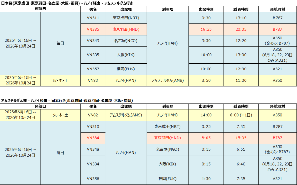 2026年6月16日より、ベトナムのハノイとオランダのアムステルダムを結ぶ路線を週3便(火・木・土)で就航します。この路線には最新鋭のエアバスA350型機を投入し、長距離路線の快適性と効率性を確保します。日本からは東京羽田発のハノイ便を経由し、同路線への接続が可能となり、夕方出発・翌日午前中にアムステルダムへ到着するスケジュールで、日本発の利用者の利便性が高まります。これにより、ベトナムと欧州間の経済・貿易・投資・文化交流の促進も期待されます。