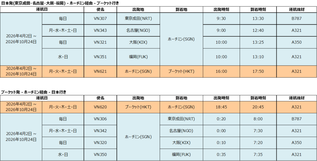 また、2026年4月2日からは、ベトナムのホーチミンとタイのプーケットを結ぶ路線を週5便(月・火・木・土・日)で新規就航します。機材はエアバスA321型機です。現在、日本からプーケットへの直行便はありませんが、この新路線により、日本からの同日乗り継ぎが可能となり、日本各地から人気のリゾート地へのアクセスが大幅に向上します。