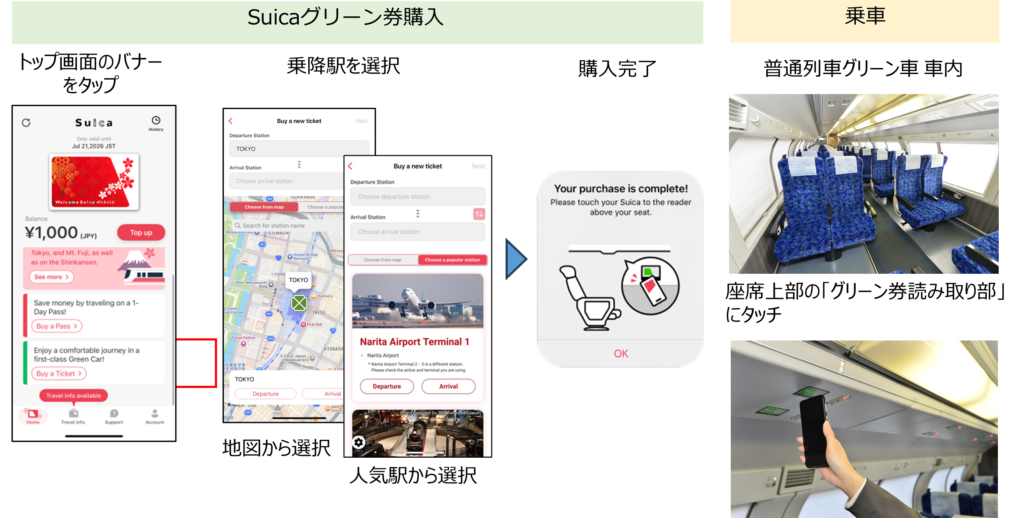 新機能により、「Welcome Suica Mobile」アプリからApple Payを利用し、乗車日当日分のSuicaグリーン券を購入できます。この購入方法は、紙のきっぷよりもお得な「Suicaグリーン料金」が適用される点が特徴です。なお、電子マネー(SF)での購入はできず、利用端末1台につきお一人様分のみ有効です。