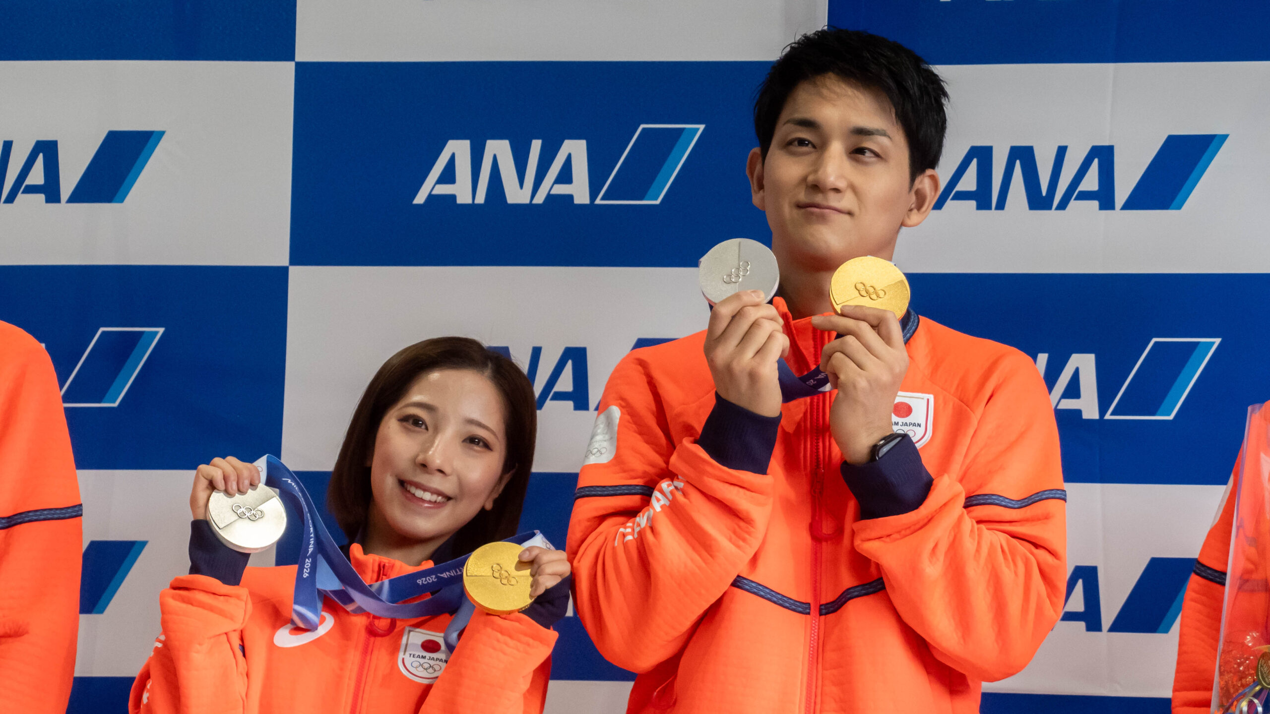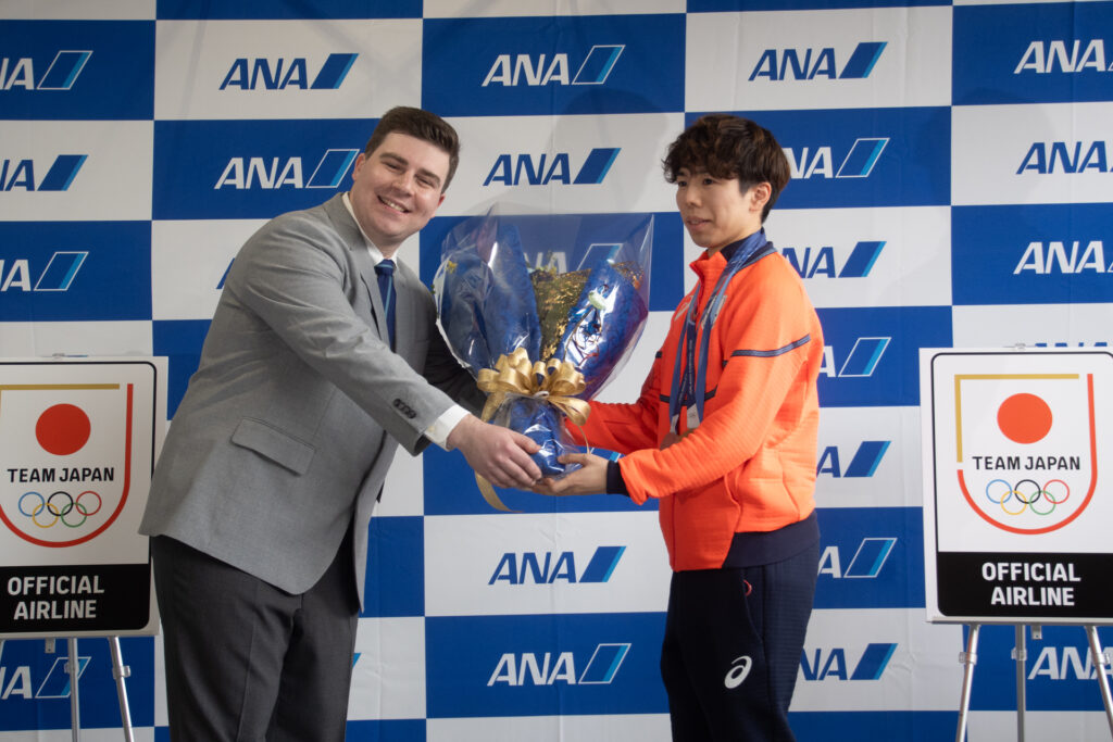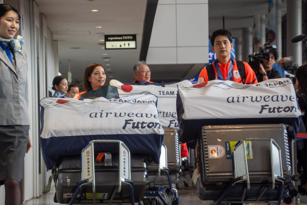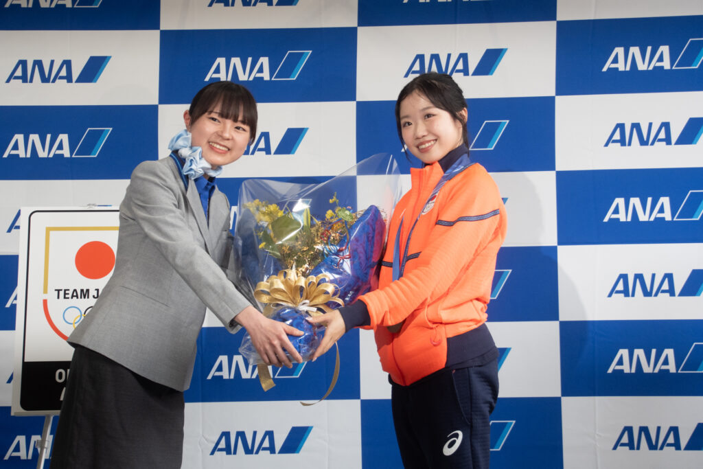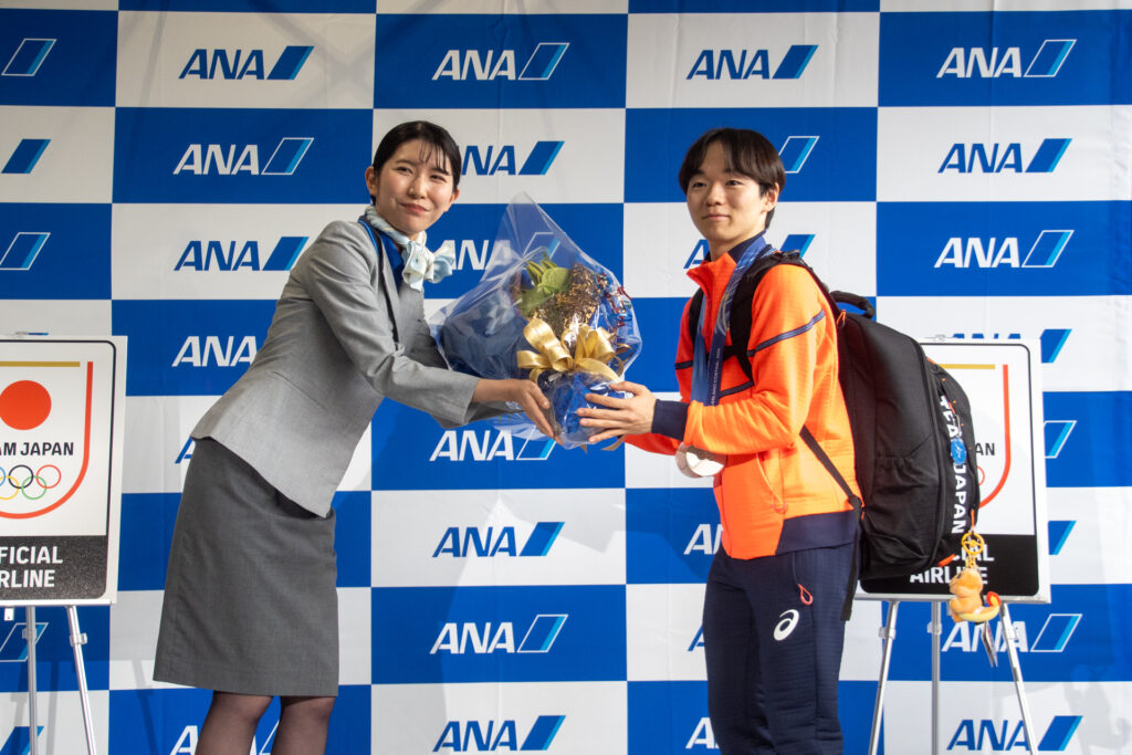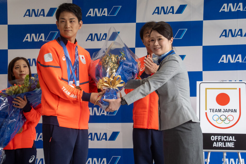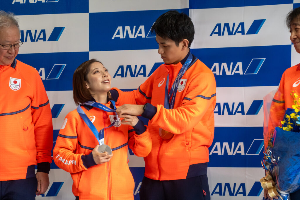 代表して挨拶に立った三浦・木原ペアは、「金メダルをとることができて本当に嬉しい」と結果を報告し、「心が折れそうな瞬間も皆様からの応援で2人で戦い抜くことができた」と感謝を述べました。セレモニー後は報道陣向けのフォトセッションが行われ、到着行事は終了しました。