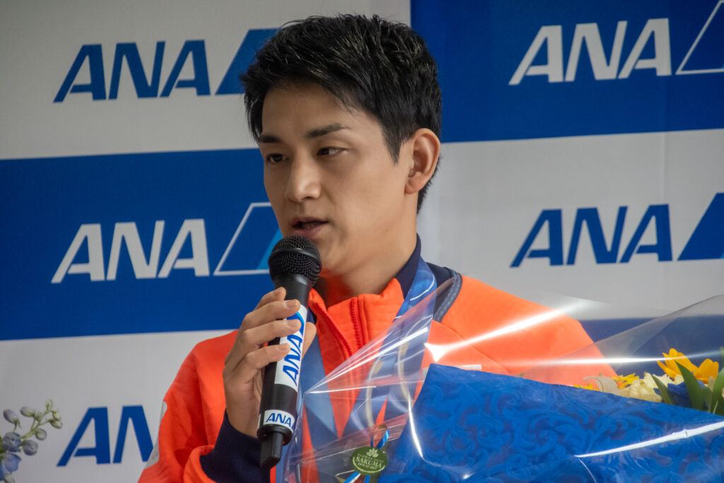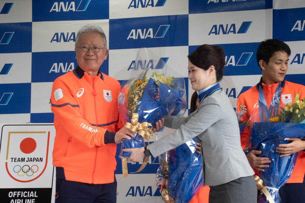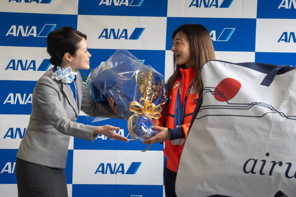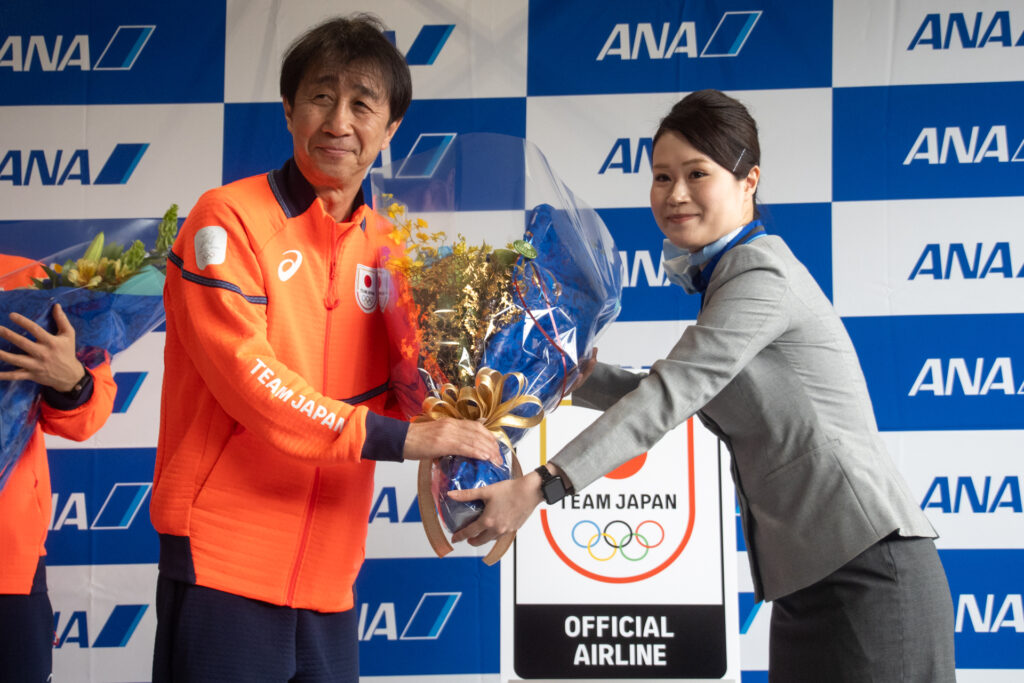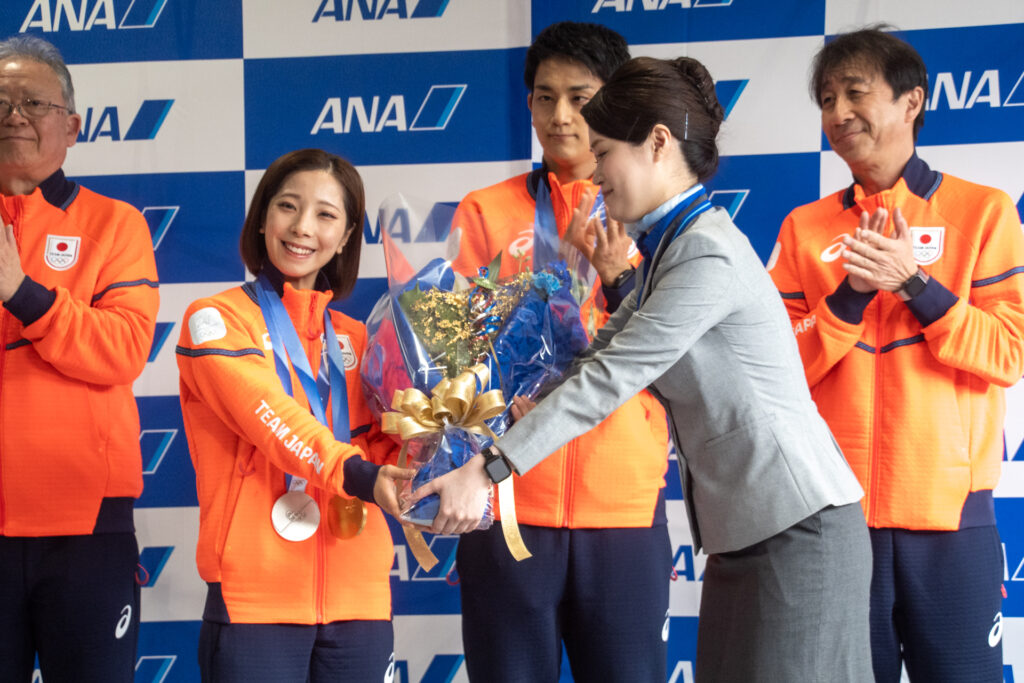 選手らはフィギュアスケートを先頭に、カーリング、スピードスケート、スキー、アイスホッケーと競技ごとにまとまって姿を見せました。到着セレモニーでは、伊東秀仁団長、原田雅彦副団長、フィギュアの三浦璃来・木原龍一両選手へ花束が贈呈されました。
