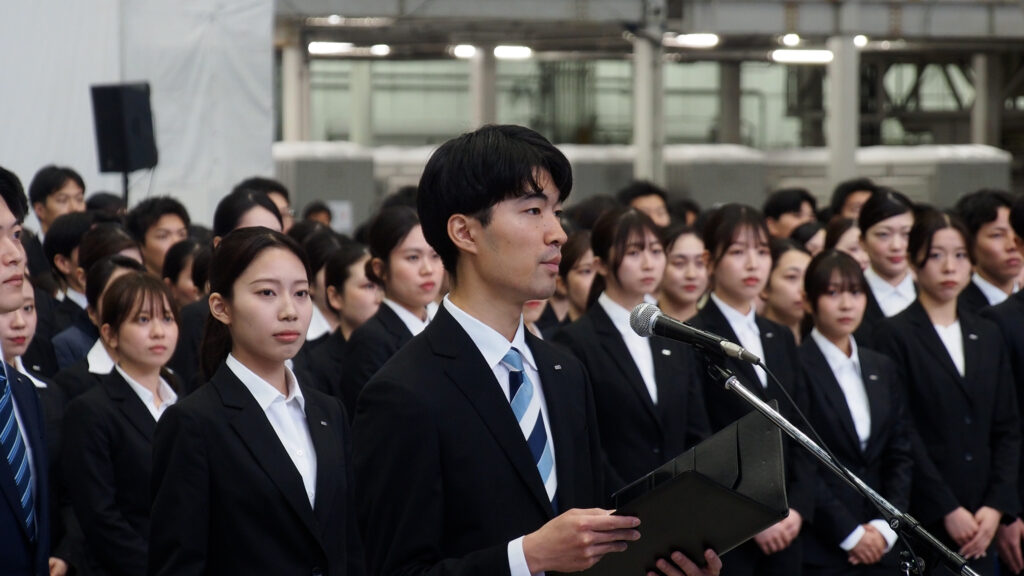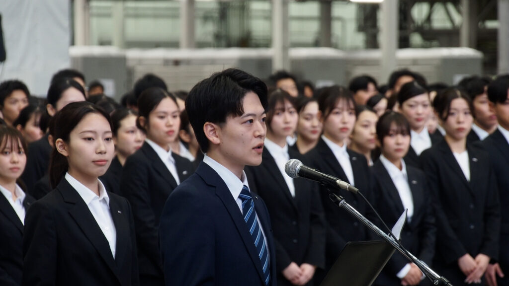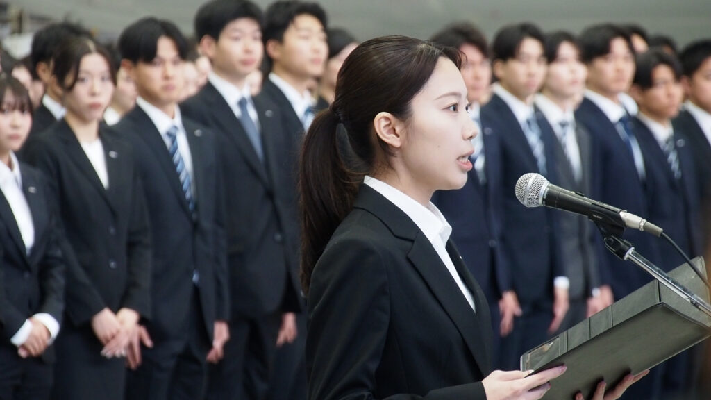 続いて、伊原由佳さん(全日本空輸株式会社 グローバルスタッフ職)、鳴海翔さん(ANA新千歳空港株式会社 総合職)、馬田匠さん(ANAテレマート株式会社 総合職)の新入社員代表3名が登壇し、安全の維持と新たな価値創造への挑戦を力強く誓いました。