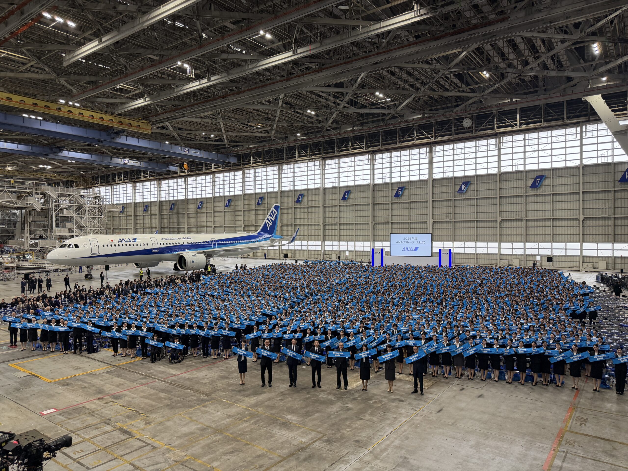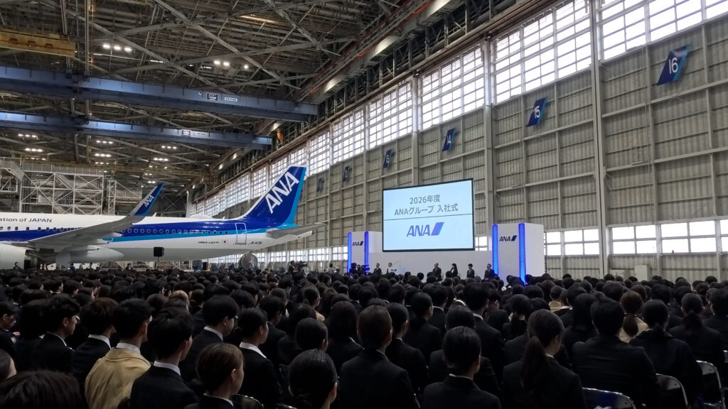 2026年4月1日、ANAグループは羽田空港のANAエアフレームメンテナンスビル格納庫にて「2026年度 ANAグループ合同入社式」を開催しました。今年度は、グループ化後初めての参加となる日本貨物航空(NCA)を含め、グループ40社から約2800名の新入社員が出席しました。