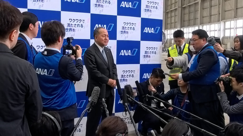 式典終了後、囲み取材で芝田社長は新入社員の印象について「全ての人の目が生き生きしており、熱量を肌で感じた」と述べ、個性を失わずに互いを助け合うチームワークを大切にしてほしいと期待を寄せました。また、今後の事業環境に関して、中東情勢などの地政学リスクへの対応や燃油サーチャージの動向、エアージャパン塗装機のANA機材としての活用などについて、状況を注視しながら適切に対応していく考えを示しました。