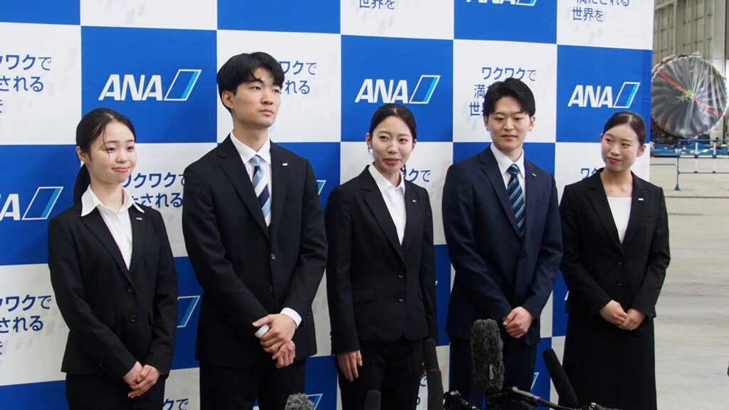 続いて今年度の新入社員を代表して全日本空輸株式会社 グローバルスタッフ職 伊原由佳さん、ANA新千歳空港株式会社 総合職 鳴海翔さん、ANAテレマート株式会社 総合職 馬田匠さん、全日本空輸株式会社 客室乗務職 増田玲奈さん、日本貨物航空株式会社 事務系総合職 東野文香さんが囲み取材に応じました。