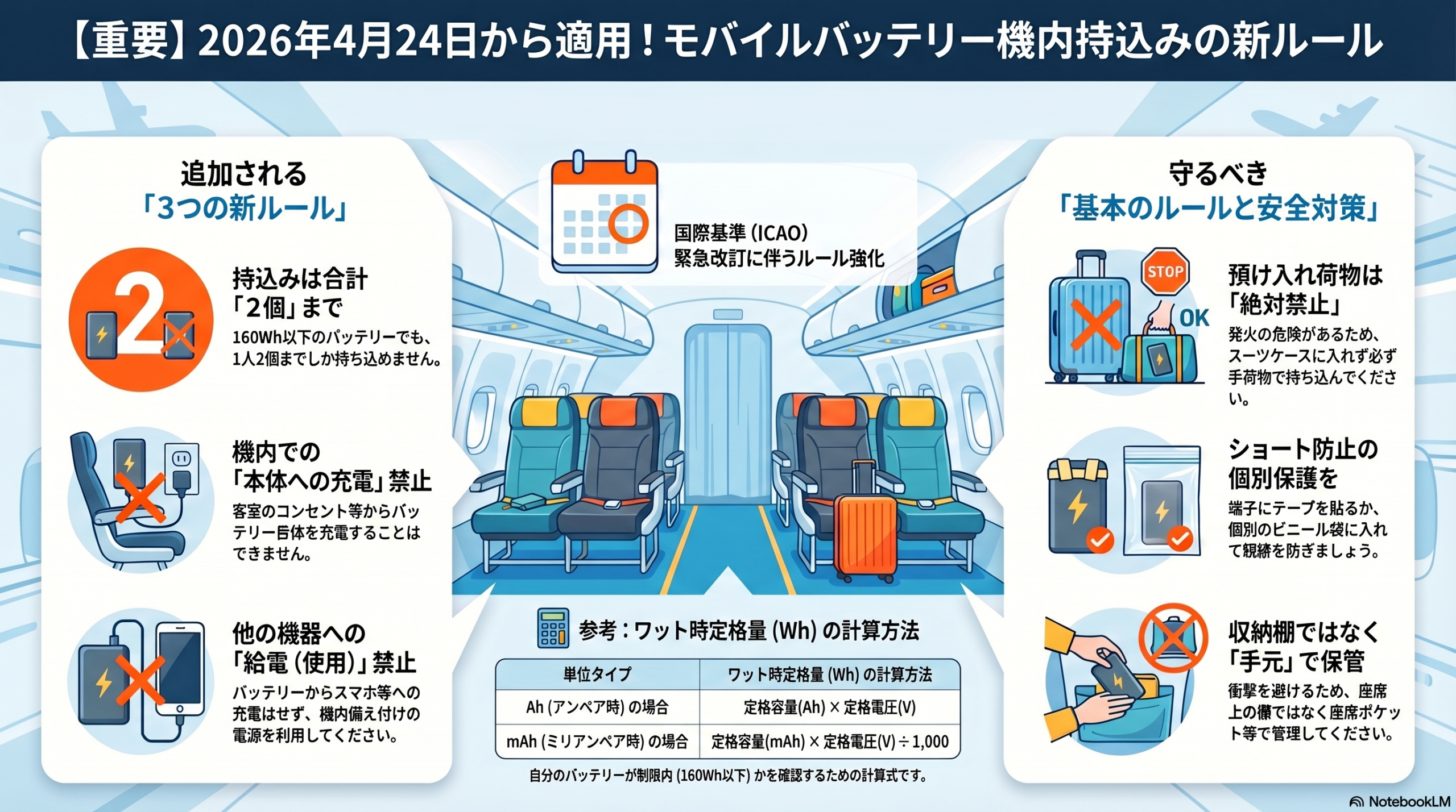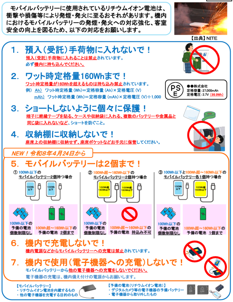 国土交通省は14日、航空機内へのモバイルバッテリーの持ち込みに関する新たなルールを発表しました。この新ルールは、国際民間航空機関(ICAO)による国際基準の緊急改訂に伴うものであり、令和8年4月24日より適用されます。